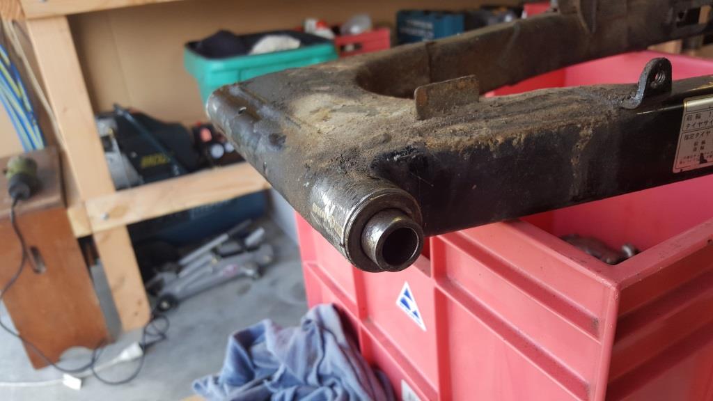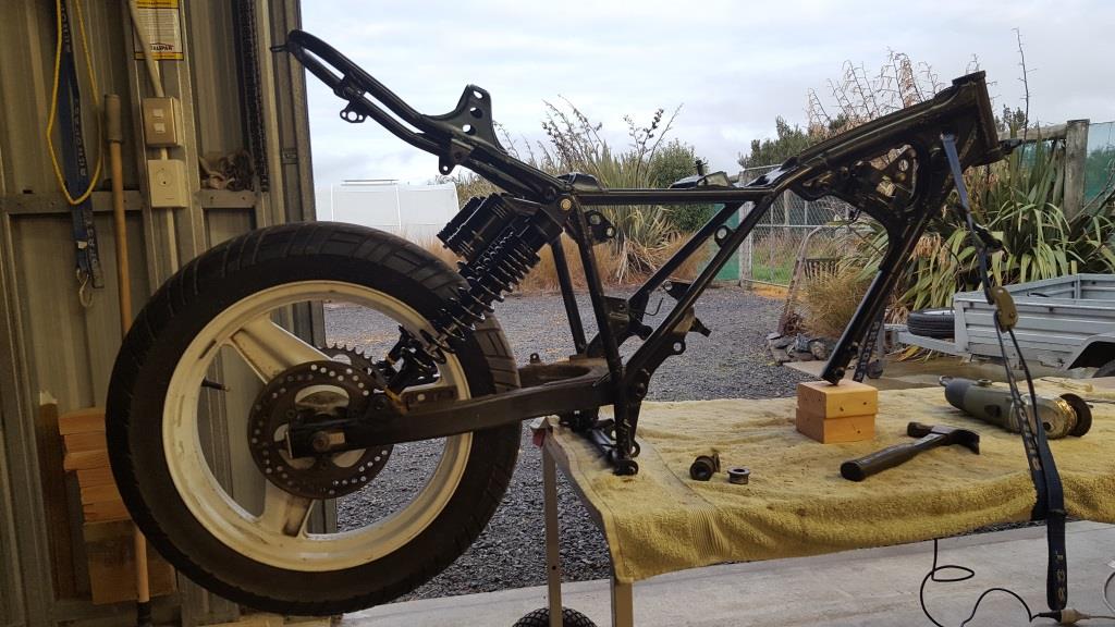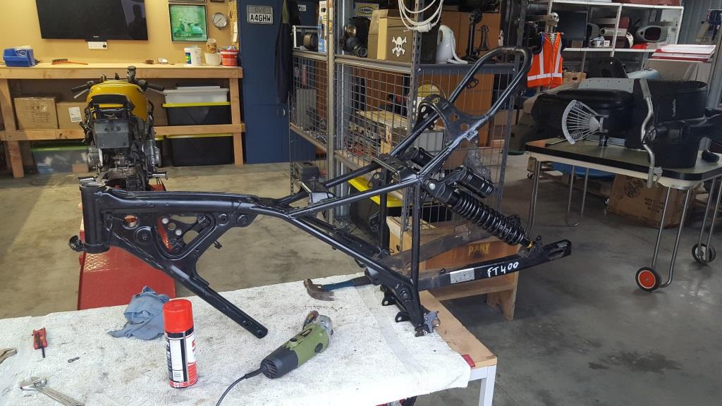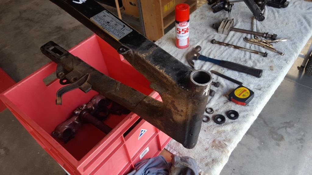 I had read on one of the thumper forums that replacing the XL swingarm with the FT one was possible with not too much hassle. The FT is wider at the mounting point and longer with the bottom shock mounts a little further back than the XL one. After a bit of measuring and cutting then a bit of grinding the FT swingarm fitted into the frame fine. Everything looks fine but the new shock mounting points, are further back with the longer swingarm. Because of this I have lost a bit of rear suspension travel but probably wont notice it too much as I’m not planning on doing any serious off road riding.