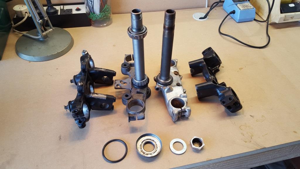 By using the All Balls chart and fork conversion tables – here – and physically measuring the stem I was able to get a rough idea if the whole triple tree was ever going to work or not. The original XL forks were 35mm diameter and the CBR ones are 37mm so with the FT being close, it was just a matter of seeing which upper and lowers would need changed and how the stem would have to be adapted.