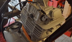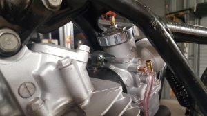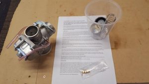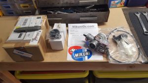 The bike also came with the factory carburettor, a 32mm Keihin, which has a double cable system (push/pull) for the throttle. I didn’t want to use the old carburettor as most thumper type forums had recommended upgrading to a Mikuni 38mm as one of the easiest ways to get more horsepower out of the stock engine. If you order the VM38 kit from the Australian website – https://www.mikunioz.com/shop/mikuni-vm-round-slide-carb-kits-4-stroke-read-disc-to-select/ they are very helpful and recommended the correct jetting kit for this engine. Getting the right flange for the carburettor spigot is also essential as the whole carburettor hangs off this and it must be an airtight fit. The kit comes with a quick action throttle and a throttle cable. You may need to consider changing the throttle cable adjuster depending on the frame of your bike and what the access to the top of the carburettor will be like . I went for a chrome POD type air cleaner instead of using the original air box assembly.