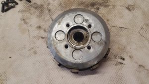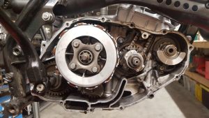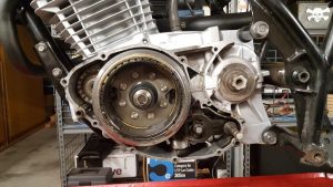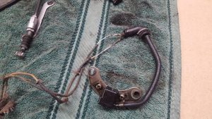 I drained the oil, removed the clutch and stator and basically checked to see if everything was okay. Both the stator and the ignitor cables were in pretty bad shape with the ignitor cable having been soldered up numerous times. I was lucky enough to source a used stator cable in great condition and a NOS ignitor cable and assembly, both off Ebay. The stator is only 6 volts and my plan is to eventually change to a 12v system as I purchased a used 12v stator out of a CB250 which should do the job nicely. The clutch was in pretty good condition and the plates were still serviceable according to the Haynes manual so it and the NOS ignitor cable went back into the engine. I put the 6v stator with the new cable back in the bike for the meantime. Once the engine starts and runs I will upgrade it to 12v. I have an XR500 flywheel that I got with some other parts, which is a little bit lighter but I don’t know if I will put that in it or not.