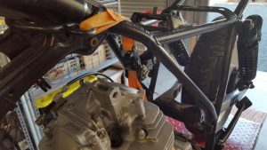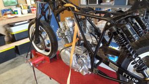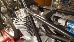 The first issue I had with getting the engine back into the frame was that there were no engine bolts and mounting hardware in the box of parts that came with the bike. Ebay was able to help with that and a complete set turned up within a week from the US. The next issue was trying to hold the engine in the frame to get one of the bolts in and because the engine is structurally part of the frame, this was quite hard to do. The only way I could get it to work was to have a few beers and then use a tie down strap to raise the engine up off the lift and then ratchet it up into position. Once the engine was mounted in the frame, one of the old seat brackets had to be cut off to allow for the new air cleaner to fit and the throttle cable, at the top of the carburettor, just cleared the frame nicely.