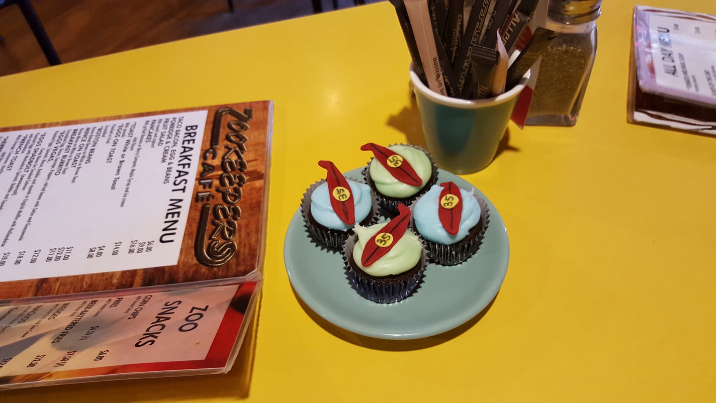 I took the scooterists to a local cafe, Zookeepers, where they make pretty good coffee and cheese rolls. We ordered breakfast and Nathan and I got the mutton bird – yummo!! Matt and Kelvin weren’t too keen on it but we all got given a cupcake as part of our order. Great to see a local business getting into the spirit of Burt Munro.