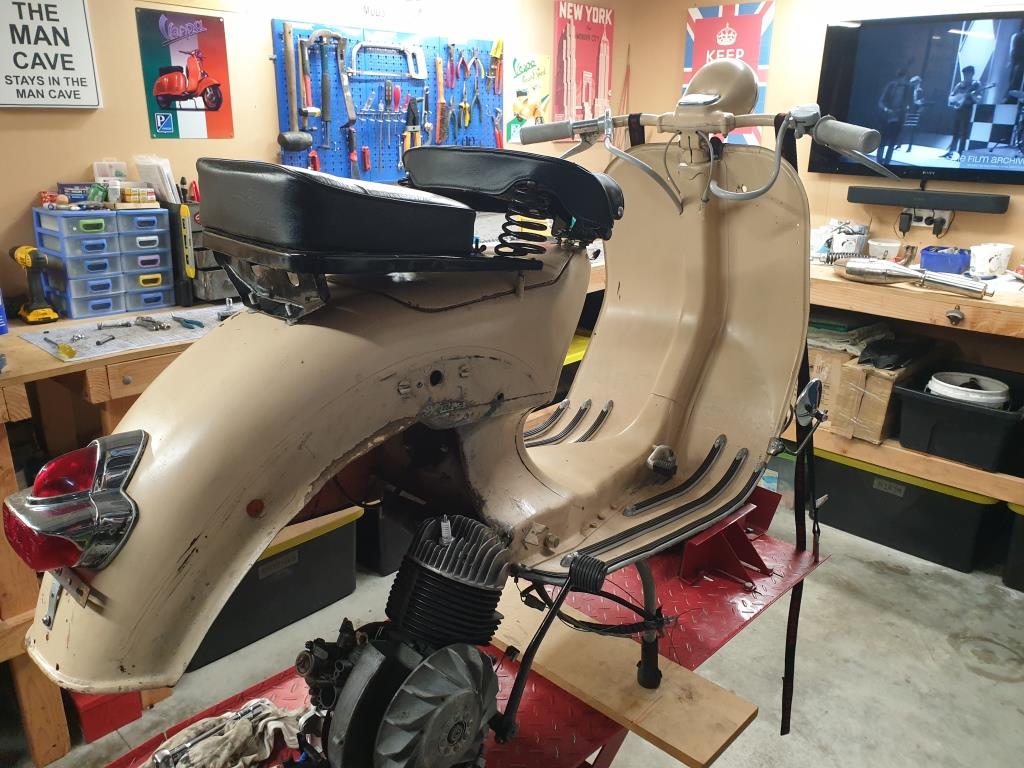 As time goes by and you collect more parts and scooters sometimes you get lucky. Not always but sometimes. I got a GS150 VS3 engine as a part trade. It had been reconditioned by a friend and had some expensive engine upgrades installed. There is a niche market for performance parts for these older 1950’s engines and frames, however they can be fairly pricey. This wasn’t running when I got it but was reasonably complete and looked in very good condition. One of the best upgrades for this engine was a 12v ignition and lighting system by Pinasco. It was really the only option available at the time this engine was rebuilt but now the SIP vape system has proved to be an excellent alternative. The plastic CDI unit had a broken mount but that was easy to replace with an aftermarket one. It had an aftermarket intake and a Polini CP23mm carburetor both upgrades to the factory Dellorto fuel system. I had never used one of these tiny carburetors before and had to have a read up on them before getting the engine running.