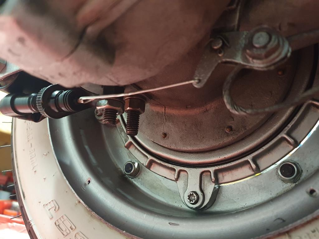 Luckily getting the engine running and installing it into the Douglas frame was pretty straight forward. There were some issues with the throttle cable as the cable for the PX carb was too short and the Polini only had a pull choke and not a cable operated one. Replacing the pull choke was easy enough and the wiring was pretty straight forward as well because there had been a 12v system in place with the PX engine, I only had to modify a few things to get the lights working. A new, longer throttle cable, fuel line, angled foam air filter and a homemade choke assembly, sorted out the fueling system and I had a brake switch off a Honda motorcycle in my cack stash. While investigating how to get the brake switch working, I discovered one of the bolts for the rear suspension mounting bracket had stripped. As it turned out these were both UNC bolts and were very hard to find locally so were replaced with longer metric equivalent ones. The longer bolts made for a good mounting point for the brake switch and the brake actuator had a tab with a hole in it for just this sort of thing.