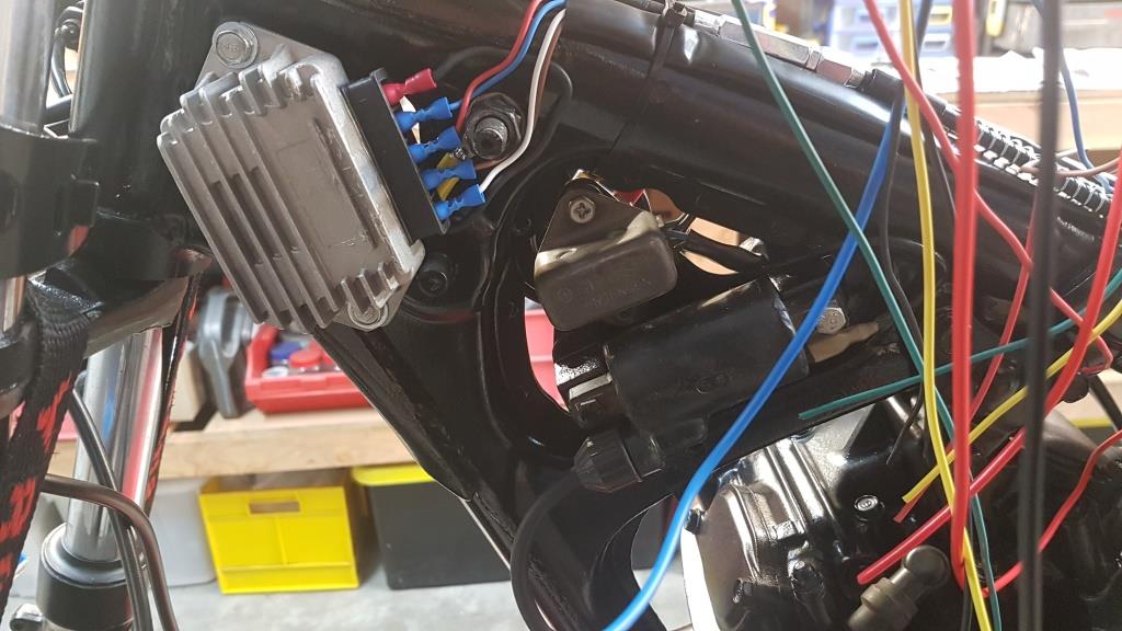 Running the cabling around the frame is pretty straight forward and I have just extended the cabling where required to get to a point under the tank. I have soldered and heat shrinked all connections and maintained the colour codes for most of the lights. I had some 12v LED’s for the front and got a combo tail light for the rear. The headlight is very bright but I don’t know how it will go with the regulator I am using.