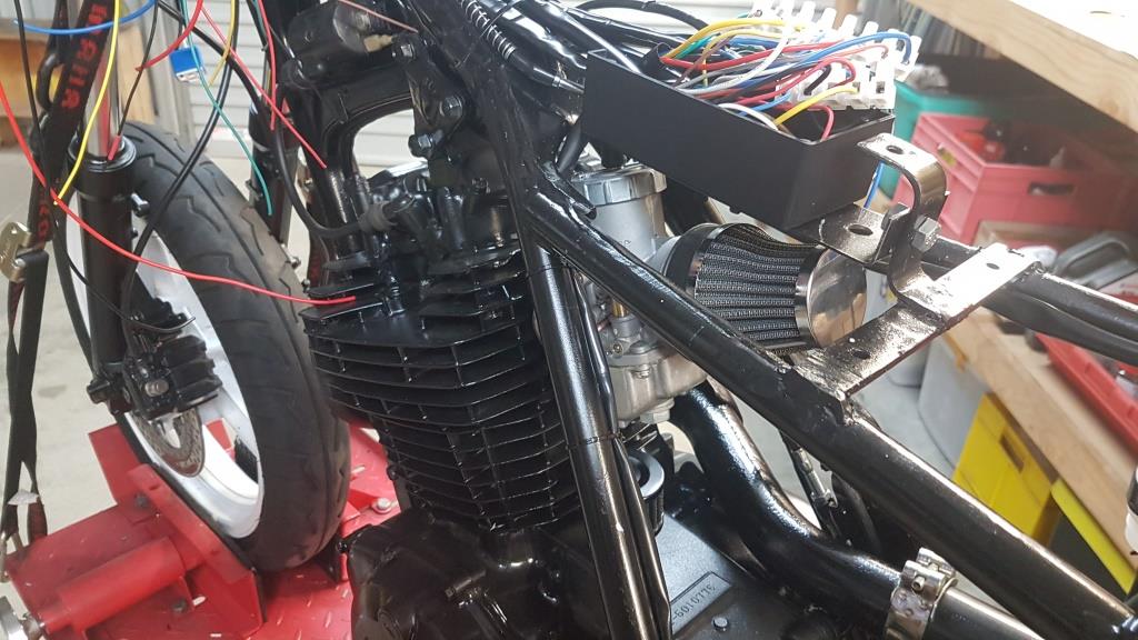 I have seen a lot of cafe racer style projects based on road bike frames and engines that allow for easier wiring under the seat with a battery in its original position or in the rear hump of the cafe seat (if it is made of fibreglass or similar and has a cavity for that). This frame for this project doesn’t really allow for a battery and the best place to centralise (and conceal) the wiring would have to be under the tank.