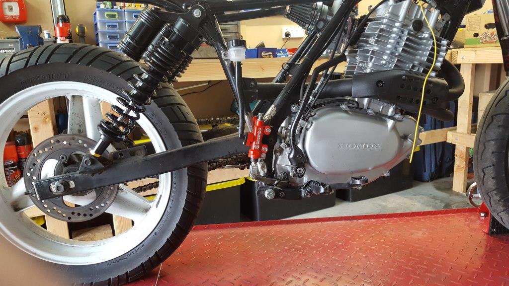 The CBR600 donor bike had been sitting for a long time and the front disc brakes were seized solid, so I will have to get some caliper kits and new brake pads all round. The brake lines have all been replaced with new braided ones because the original ones didn’t fit anymore and I had to figure out how the rear brake would now work. The original XL rear brake was just a cable from the rear hub’s brake arm that connected to the foot brake pedal and was activated by the pedal pivoting on a shaft and pulling the cable.