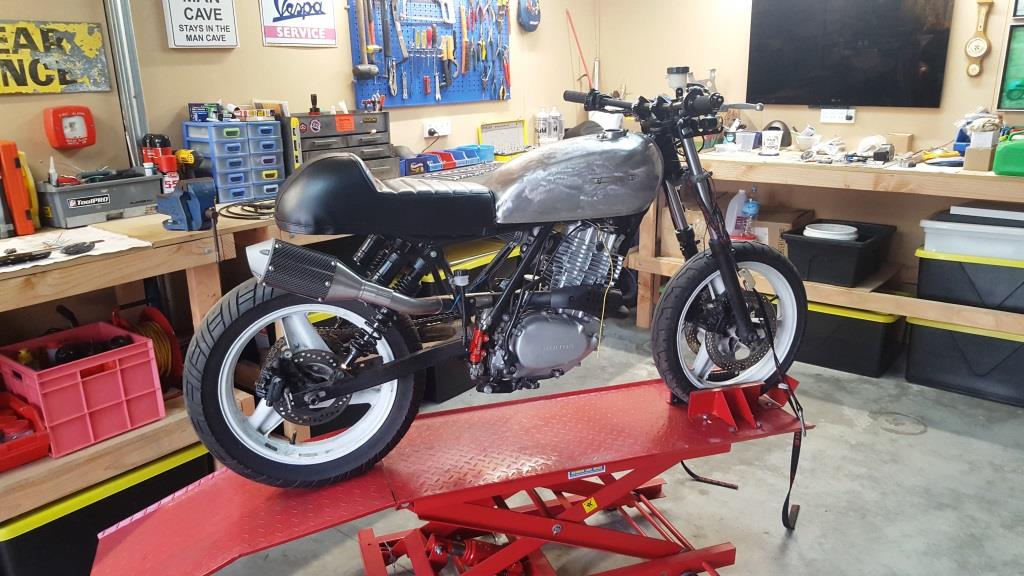 The bike is pretty much assembled and looks OK for a first attempt. Its not quite the pure Cafe style I was after but more of a fusion cafe/motard thingy.