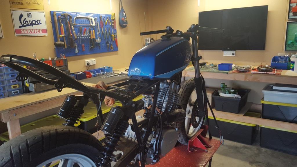 So progress has been a bit slow but things are coming along and after another trade me purchase, the frame may now have a new petrol tank. The original XL tank that came with the bike had no fuel cap, was dented quite badly, was missing the tap and I didn’t really like the “look” of it. Trying to envision what another tank would actually look like, without photoshop or a similar image editor, has been quite hard but then you also have to consider the practical things like: