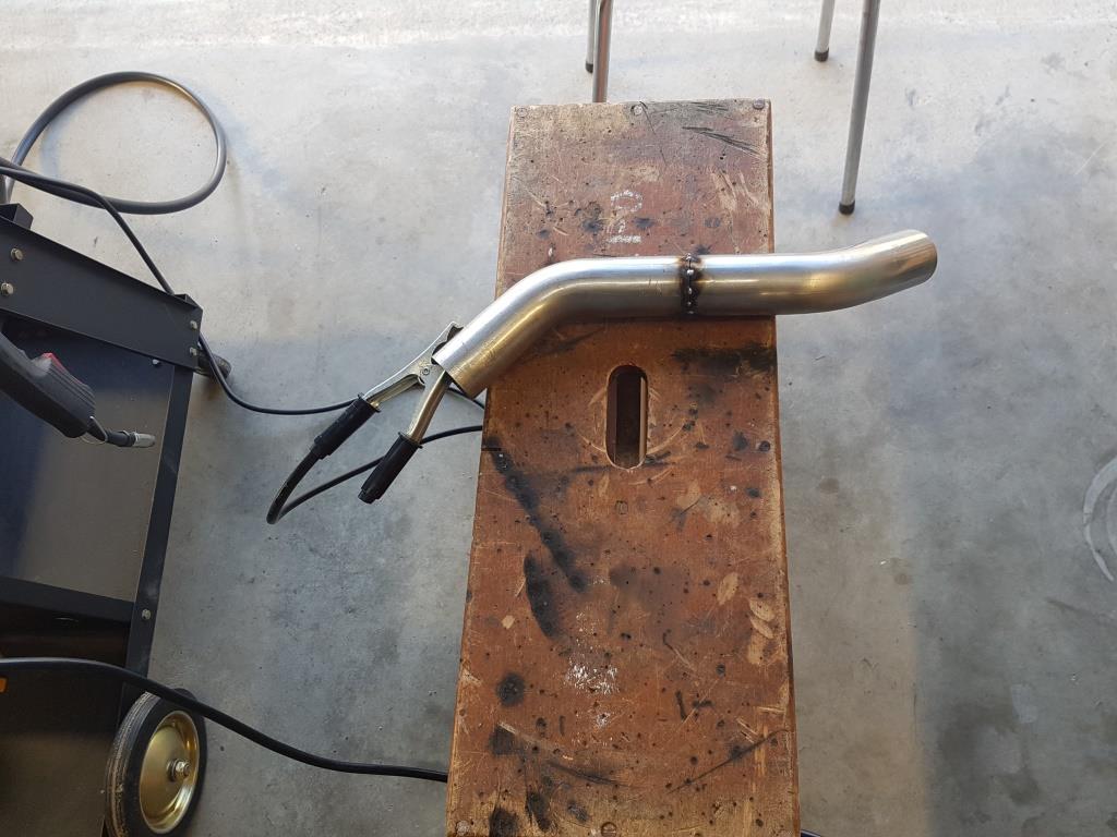 I had considered many possible options to re-route the pipe and what muffler to use and was constrained by the room I had between the rear tyre and the frame. Also I don’t have a pipe bender and limited welding skills. While looking for possible “bolt on” exhaust systems I found on Trade Me, some mild steel mandrel exhaust tubing. They come in various shapes, lengths and diameters and looked like the right thing for me. I measured up the collector pipe diameter and found a 45 degree bend with an internal diameter to fit on to it and purchased two of them. This allowed me to see what my options were for routing the pipe through the frame or out and around the new rear shocks.