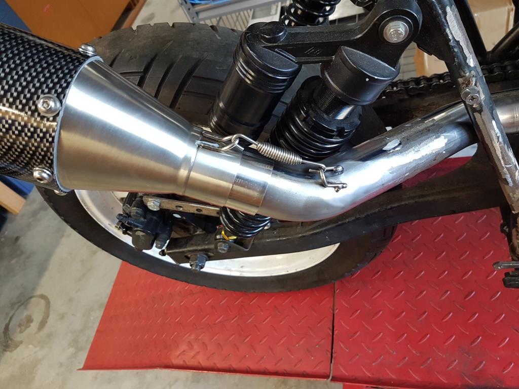 Most of the Cafe style bikes I have looked at online, tend to have two rear swept mufflers exiting from a twin or four cylinder engine. My initial thought was to take this route and make a two into two system to replace the existing two into one exhaust. I could probably pay an exhaust shop to make a system to suit and then go to the trouble of making everything fit but I will make it as easy as I can for myself and may reconsider another exhaust option at another time.