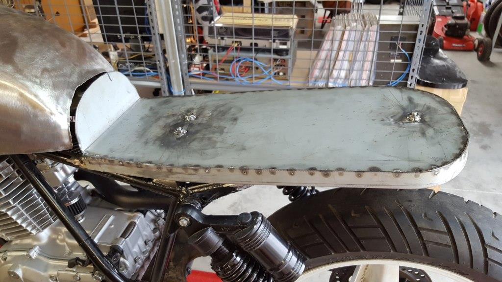 After cutting the rear frame again and then welding the original rear seat hoop back on, but turned upside down, the frame looks not too bad. Certainly not 100% level but close enough for a first time fabricator. After making a cardboard template to fit the rear hoop and butt up to the tank I then used that to cut out a bit of 2mm mild steel I had. Once I had the shape right and bent the front of the seat base, I tacked on a 30mm side strip to try and cover as much of the rear frame as possible.