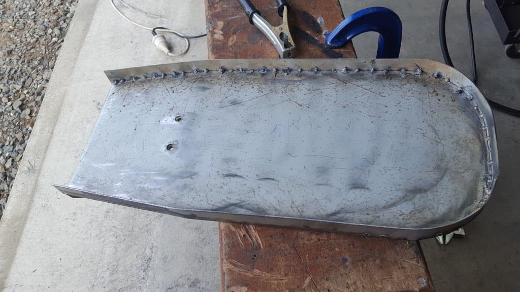After cutting the rear frame again and then welding the original rear seat hoop back on, but turned upside down, the frame looks not too bad. Certainly not 100% level but close enough for a first time fabricator. After making a cardboard template to fit the rear hoop and butt up to the tank I then used that to cut out a bit of 2mm mild steel I had. Once I had the shape right and bent the front of the seat base, I tacked on a 30mm side strip to try and cover as much of the rear frame as possible.