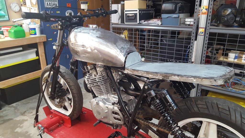 After cutting the rear frame again and then welding the original rear seat hoop back on, but turned upside down, the frame looks not too bad. Certainly not 100% level but close enough for a first time fabricator. After making a cardboard template to fit the rear hoop and butt up to the tank I then used that to cut out a bit of 2mm mild steel I had. Once I had the shape right and bent the front of the seat base, I tacked on a 30mm side strip to try and cover as much of the rear frame as possible.