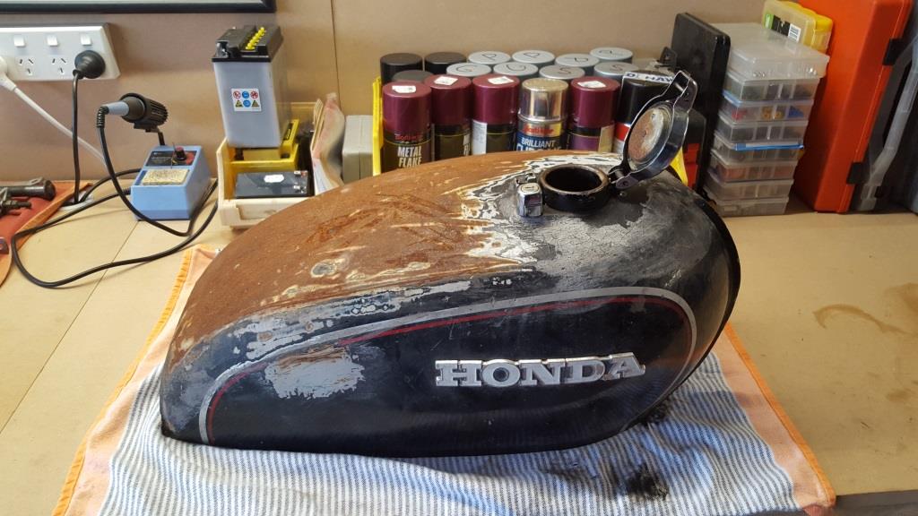 It looked like the previous owner had left the tank outside for a bit as the paint was shot and it had a bit of surface rust but it didn’t leak, had the factory tap and fuel cap and only had a few dents to sort out. Inside the tank there was also a bit of surface rust, as you would expect and after a few cleans with some nuts, bolts and water it was basically in a condition to rust treat and line the interior of the tank with some Por-15 tank products.