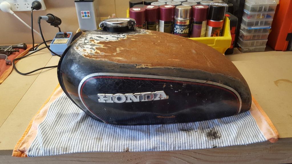 It looked like the previous owner had left the tank outside for a bit as the paint was shot and it had a bit of surface rust but it didn’t leak, had the factory tap and fuel cap and only had a few dents to sort out. Inside the tank there was also a bit of surface rust, as you would expect and after a few cleans with some nuts, bolts and water it was basically in a condition to rust treat and line the interior of the tank with some Por-15 tank products.