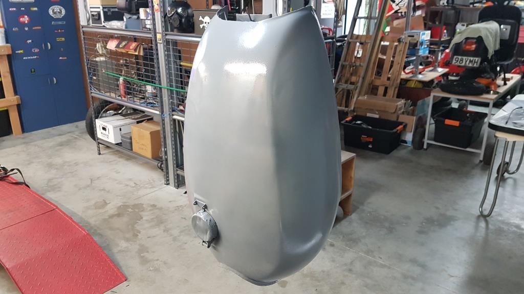 For this tank the interior treatment was just the start of a long process. The exterior paint was stripped then the dents were filled in – one came out with a long piece of metal just angled the right way through the petrol filler. The tank was then painted with rust inhibitor and primed.