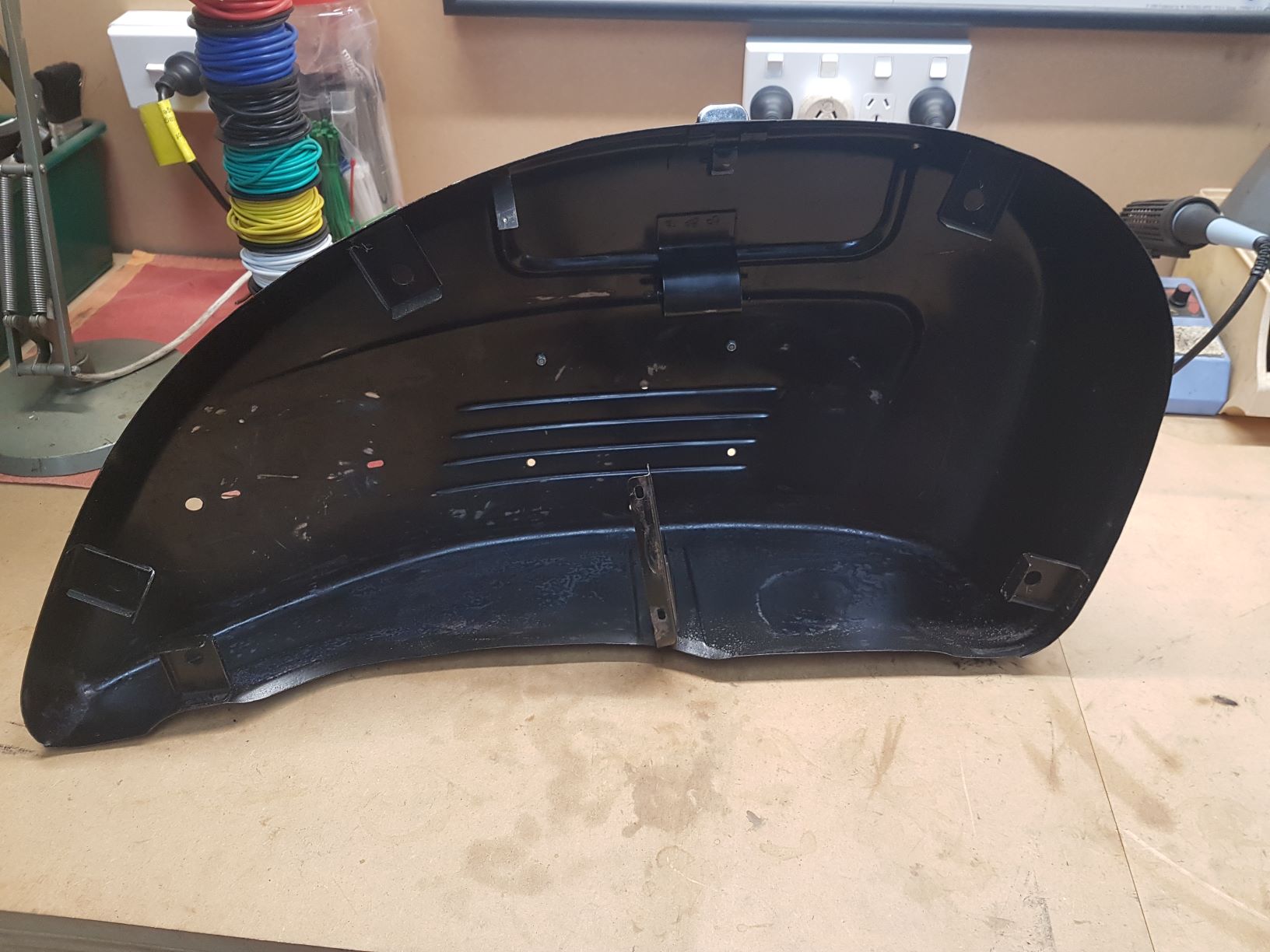 The bottom bearing race on the fork had worn quite badly and the wheel hub and axle were damaged so the first job has been to get that all replaced and installed. One of the sidepods had a small rust issue which was an easy fix with a rust inhibitor and some paint. One of the floor rails had been loose since we purchased the scooter a few years ago and that got some new rivets.