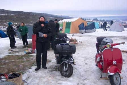 We were lucky enough to find a couple of scooterists we knew and set up camp with them. Jess from Wellington had ridden down from Christchurch on her 152L2 and Brent had ridden his malossi kitted vespa from Christchurch as well. Clive and Tony had ridden their PX’s from Dunedin so we were in good company. We also saw a white GS160 with a wooden fairing that belonged to a local Otago Vespa Club scooter stalwart from Alexandra and a collection of step thrus, mopeds and twist and goes. There was about four inches of snow on the ground where we pitched our tents and everyone was soon after the bits of cardboard boxes that were available for insulation from the snow. After a quick tent set up and unpacking the gear off the scooters it was into the coffees and a quick chat around the nearest fire drum. Andrew soon had the Billy on and I soon discovered just how yucky the cappuccino sachets were. We were near where the freestyle motocross guys landed on their jumps and close to the toilet facilities so all in all, well placed.